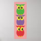 3 cute owls on a pink background. Red, purple and green. Slim, vertical. Fits in the narrow space between things. Hand drawn owls with 2 of them sitting on top forming a stack of cute owls. byEML