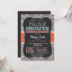 Bridal shower invitation with cute chalkboard look font on orange, teal green colours and warm grey paisley pattern. Vintage feel chalk fonts on cool blackboard background with ric rac design element.