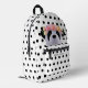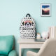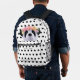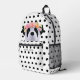 A cute panda bear with flowers in her hair, all on a black and white polka dot backpack. Just add your name
