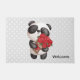 A welcome doormat with an adorable watercolor drawing. An adorable black and white panda bear carrying a bouquet of roses. Grey with white polka dots background.