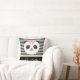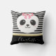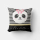 Cute panda bear with pink ribbon pillow. Kawaii panda bear with pink cheeks, with a pink floral ribbon. Stylish trendy black and white lines striped background with golden ribbon. Easily customise and add your name to personalise the pillow.