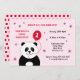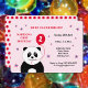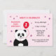 This cute 1st birthday party invitation has a smiling panda with a red 1st birthday balloon. At the top, the editable text is "Help us celebrate!" The text for "Madison's First Birthday" is also editable. The background of the card is pale pink, with scattered red, white and blue stars. The back of card has a polka dot pattern in red on pink, and there is a single star in the centre.