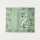 Modern Cute panda unisex first birthday backdrop tapestry, featuring an eucalyptus green background, two cute baby pandas eating bamboo leaves, dark green watercolor foliage, name and date that is easy to personalise.