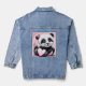 This is an illustration of a panda holding a pink heart. The background is pink with 2 bamboo leaves. The panda is black and white with fluffy fur and is sitting. The panda is a symbol of peace, harmony, and gentleness. It is a gentle creature that lives in balance with nature. The panda bear's expression is adorable, making this image a heartwarming sight.