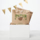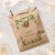 Fun light and dark green jungle leaves decorate these jungle theme | sloth birthday party thank you favour bags. Cute party sloth hanging from a vine in the jungle sporting a blue and white polka dot hat. The words "thanks for hanging out" are in curved text below the partying sloth with birthday boy's name front and centre. Shown here on brown kraft but can be changed to white. Perfect favour bags for animal, zoo, sloth, or other safari / jungle theme birthday party Thanks for hanging out!
