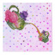 All cute pastel coquette with a tea party setting, tea cups, pastries, candle drum, bird, cat, butterfly, bee, dragonfly, cute things and etc