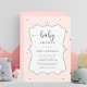 This baby shower invitation features a pastel polka dot pattern with a decorative frame on a blush pink background.