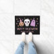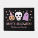 This super fun Halloween door mat is perfect for the fall season and to welcome trick-or-treaters! It features a hand drawn skull, ghost, jack-o-lantern pumpkin (wearing a witch hat), and stars, along with modern typography, reading, "Happy Halloween!" A text template is included for easy personalisation. The colour scheme includes pastel pink, purple, and peach.