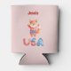 Cute patriotic can cooler features watercolor fox dressed in patriotic outfit with stars and stripes "USA" on pale pink background