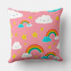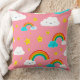 Colourful seamless pattern depicting smiling clouds, vibrant rainbows, yellow stars, and blue clouds on a pink background. This cheerful design is ideal for children's products, wallpapers, and creative projects.