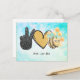 Cute design with sparkly black peace symbol, gold doodle heart and whimsical bee on a background of watercolor clouds.