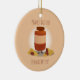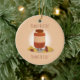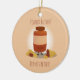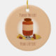 Ornament with an illustrated design of a smiling peanut butter jar that is standing between two piles of peanuts. The words “Peanut Butter? Peanut Better!” show above and below the cartoon character. All of the words can be customised.