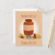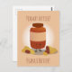 Postcard with an illustrated design of a smiling peanut butter jar that is standing between two piles of peanuts. The words “Peanut Butter? Peanut Better!” show above and below the cartoon character. All of the words can be customised.