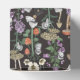 Cute black favour gift boxes for Halloween baby shower favours. The cottagecore design features moody fall floral illustrations of poisonous plants like belladonna, hemlock, and black poppies. Cute mushroom ghosts fly around the flowers. The text can be easily customised with the details of your baby shower.
