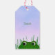 These cute gift tags for frog lovers features an illustrated green frog with large eyes that appears to be partially submerged in a pond at the lower edge of the tag, keeping watch for what may be approaching from the distance, peeking through a few blades of grass under a blue sky that has a pinkish hue - customise with name or your message - part of katz_d_zynes' "Froggy" collection >> https://www.zazzle.com/collections/119251288586496545
