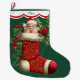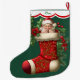 We all know that Santa Claus is magical (right?!) so it shouldn't be surprising that he can hide himself in a Christmas stocking! Here he is, peeking out of an ornate stocking that is filled with holly, red berries, and poinsettia blooms. I'll bet there's candy and toys at the bottom! A white scalloped edge design bordered in red holds your customised name at the top. The back of the stocking is identical to the front.