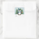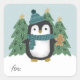 These adorable Christmas stickers feature a hand drawn penguin, wearing a hat and scarf in teal blue. He's standing in front of some Christmas trees and holding a gingerbread man cookie. Space is left to write a name for gift tag stickers!