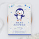 Invite your guests with this cute baby shower invitation featuring an adorable little penguin with vibrant elements on a light grey background. Simply add your event details on this easy-to-use template to make it a one-of-a-kind invitation. Flip the card over to reveal a blue and white stripes pattern on the back of the card.