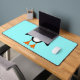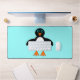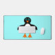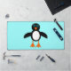 This awesome desk mat features a cute penguin character with a white tummy, big blue eyes with black pupils and cute orange feet and beak. This charming little winter bird is sure to delight children and adults. The penguin sits on an icy pale blue background to remind him of his chilly Arctic home.