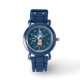 A cute blue kid gender neutral watch with a penguin drinking some hot cocoa . Personalise it with the child's name . Makes great Christmas present , stocking stuffer or birthday gift .