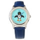 This awesome watch features a cute penguin character with a white tummy, big blue eyes with black pupils and cute orange feet and beak. This charming little winter bird is sure to delight children and adults. The penguin sits on an icy pale blue background to remind him of his chilly Artic home.