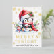 Create a stylish personalized Christmas card with a festive design that features a cute penguin in a red apparel sitting with a tiny snowman among holly berry greenery, golden yellow snowflakes and stars. This design is with some real foil elements on the front side that makes this card unique and luxury. A Merry & Bright saying and template text for greetings, family name and a year are on the card's front side. On the backside, there is a 2026 calendar (Sunday through Saturday).