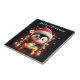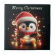 A cute penguin wearing a Santa hat sits wrapped in a string of lit colourful Christmas lights.