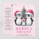 Create unique personalised non-photo Christmas cards with a festive design that features family of three cute penguins in pink Santa hats standing near a Christmas tree. A Merry & Bright saying and template text for greetings, family name and a year are on the front side of the card. On the backside, there is a full year at a glance Sunday through Saturday 2025 calendar.