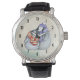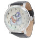 A watch with an adorable illustration of a penguin couple cuddling together. Wearing winter scarves and hats. Set on a cream coloured background.