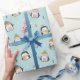 Cute penguins with knitted hats, trees, gifts and snow on light blue background
