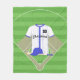 Cute baseball themed design. Featuring on the front a blue and white striped baseball jersey which can be customised with a name and number, a blue baseball cap, baseball and baseball bat. The background features a baseball field.