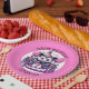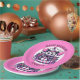 Adorable personalised Happy Birthday possum themed birthday party plates. A cute possum in a pink and purple birthday hat, with gifts and balloons celebrating a birthday.