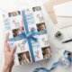 Cute Personalized Baby Photo Reindeer Christmas Wrapping Paper. Make your holiday gifts truly unforgettable with our enchanting personalized wrapping paper. This unique design features a charming grid layout, showcasing your precious baby's photo alongside an adorable whimsical reindeer illustration and festive 'Holly Happy Merry' text. Easily customize it with your child's name. Perfect for baby's first Christmas, family presents, or any special gift.