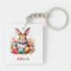Celebrate Easter and spring with this adorable personalized keychain featuring a watercolor bunny nestled among colorful Easter eggs. A charming design perfect for children and adults alike, customized with the name. This cute accessory makes a wonderful gift, a delightful basket stuffer, or a lovely way to add a touch of seasonal cheer to your keys or bag.