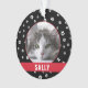 Cute stylish paw print Christmas ornament design for pet cat (or dog) name and photo of furry family member. This cute design features Background with modern black and white pet paw print pattern and a festive red accent stripe. This modern black and white pet paw print pattern will be perfect as personalised gift.
