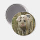 This magnet features a beautiful photograph of a cute pink spotty pig emerging from some tall grass.