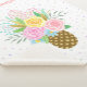 Pineapple with a crown of a beautiful bouquet of roses and leaves. Pink, coral, yellow, blue, green, turquoise, brown. Modern, fresh, joyful, cute. Pink custom name in trendy hand-written font. Colourful polka dot.
