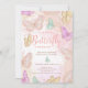 Cute pink our little butterfly is turning one chic 1st birthday invite featuring whimsical and pretty pink, yellow, teal and purple butterflies with gold glitter details on abstract pink and purple watercolor brushstrokes and dried boho pampas grass with an elegant script brush font. Perfect for spring and summer birthdays.
