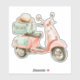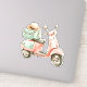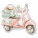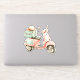 This adorable vinyl sticker features a watercolor scooter in soft shades of pink and aqua green.