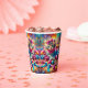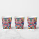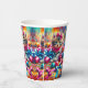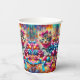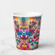 Pink and blue girl's birthday party paper cups. Cute birthday kitten playing in bows and ribbons. Colourful pink and blue ai art.