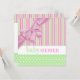 Customisable baby shower invitation template featuring a cute pink and green modern design with satin bow, stripes and polka dots.