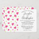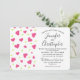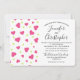 Wedding invitation with a cute pattern composed of pink and green hearts on a white background.