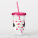 Personalised acrylic tumbler with a cute pattern composed of pink and green tumbling hearts on a white background. A fancy vintage-looking black and white decorative frame with your text inside.