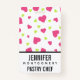 Name badge with a cute pattern composed of pink and green tumbling hearts on a white background.