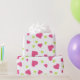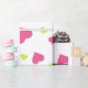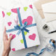 Wrapping paper with a cute pattern composed of pink and green tumbling hearts on a white background.