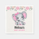 Paper napkins with a cute pink elephant watercolor illustration. She has cute pink and white polka dot ears and a pretty pink ribbon bow on top of her head. The top is decorated with a beautiful rose bouquet.