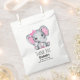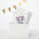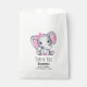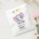 Favour bags with a cute pink elephant watercolor illustration. She has cute pink and white polka dot ears and a pretty pink ribbon bow on top of her head.