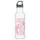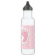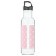 Water bottle with an adorable image of pink baby girl footprints with a heavy white outline and white polka dots on a pink background behind the illustration.