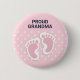 A button which says: Proud Grandma. Designedwith an adorable image of pink baby girl footprints with a heavy white outline.