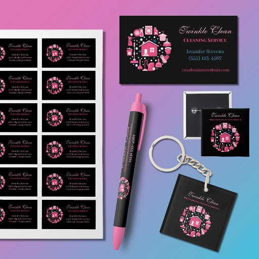 Black and Hot Pink Round Circle of Cleaning Supplies Housecleaning Service Business Vinyl Stickers. Perfect for promotional purposes and more. Personalise this with your own business details to make it your own. See collection for other matching business products like this one.